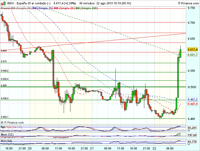 LONE__El Ibex 35 se encuentra bajo fuerte presión compradora en la sesión de hoy superando la resistencia de los 8.550 puntos, tras las abultadas caídas de las jornadas pasadas, y cotiza durante la jornada, con beneficios del 1,85%, hasta los 8.618,50 puntos, por encima del soporte de los 8.600 puntos.
