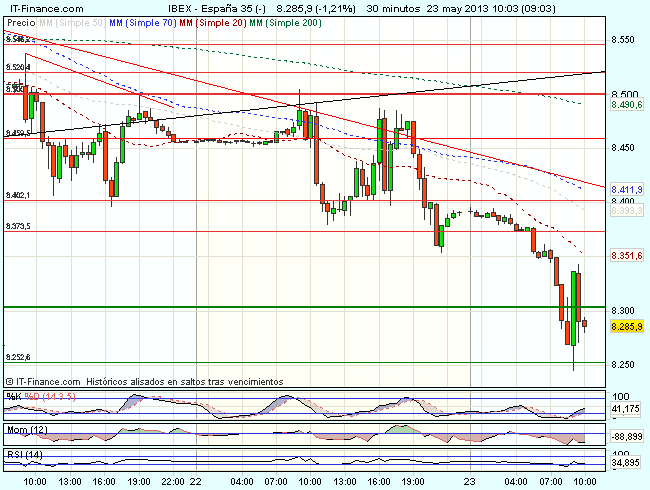 El Ibex 35 ha iniciado la sesión bajo fuerte presión vendedora y amplio gap bajista con incremento de volumen, aunque ha encontrado apoyos en el nivel clave de los 8.250 puntos que aminoran las caídas, y cotiza durante la sesión prácticamente plano con perdidas del 2,10%, hasta los 8.284,50 puntos.