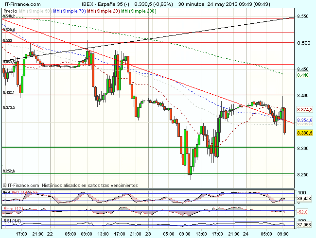 En consecuencia para la sesión de hoy, el aspecto técnico del Ibex es bajista, y mientras se mantenga cotizando bajo los 8.400 puntos, es posible la continuidad de la corrección, con objetivos los 8.250 – 8.200 puntos.