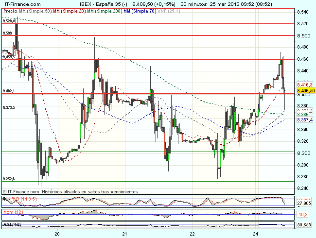 El Ibex 35 ha iniciado la sesión bajo fuerte presión compradora, aunque rápidamente han presionado las ventas en el entorno de los 8.450 puntos y cotiza durante la sesión con beneficios del 0,89%, hasta los 8.403,50 puntos, por encima del soporte de los 8.400 puntos.