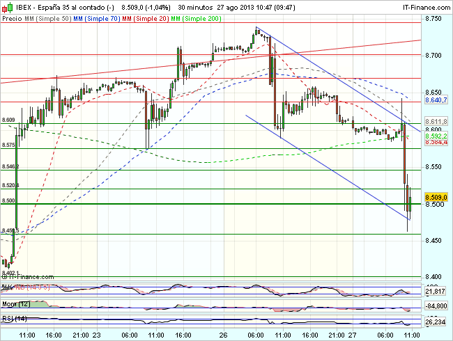 El Ibex 35 se encuentra bajo fuerte presión vendedora en la sesión de hoy, frenado ante la resistencia en los 8.650 puntos, y cotiza durante la jornada, con perdidas del 1,60%, hasta los 8.511,50 puntos, amenazando el soporte relevante de los 8.500 puntos, que ha llegado a perforar durante la sesión.