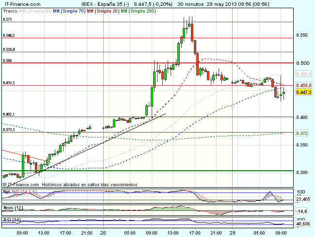 El Ibex 35 se encuentra bajo presión vendedora en la sesión de hoy, aunque esta intentando estabilizarse en el entorno de los 8.430 puntos y cotiza con perdidas del 0,75%, hasta los 8.447,50 puntos, por encima de la resistencia relevante de los 8.400 puntos.