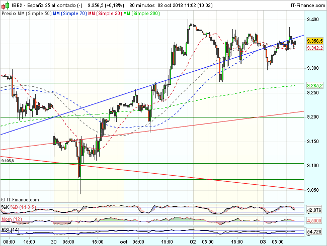El Ibex 35 se encuentra volátil en la sesión de hoy, frenado ante el nivel de los 9.400, aunque parece encontrar apoyos en el entorno de los 9.300 puntos, cotiza durante la jornada, prácticamente plano, con perdidas del 0,03% hasta los 9.346,50 puntos.
