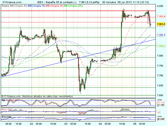 El Ibex 35 se encuentra bajo presión vendedora en la sesión de hoy, en recogida de beneficios tras las alzas de ayer, y cotiza durante la sesión, con perdidas del 0,62%, hasta los 7.952,50 puntos, frenado ante la resistencia de los 8.030 puntos.
