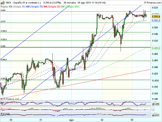 El Ibex 35 se encuentra volátil en la sesión de hoy, frenado ante la resistencia de los 8.600 puntos, que ha llegado a superar durante la sesión, y cotiza con beneficios del 0,23%, hasta los 8.593,70 puntos.