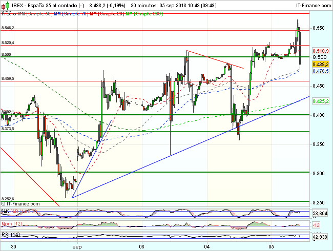 Por encima de los 8.500 puntos, el aspecto técnico del Ibex mejoraría y podríamos ver mas alzas, en dirección a los 8.600 – 8.700 puntos.