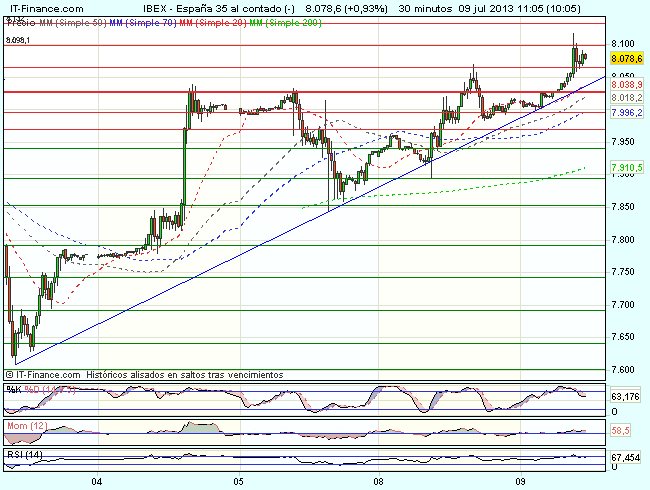 En consecuencia para la sesión de hoy, el aspecto técnico del Ibex es alcista, y mientras se mantenga cotizando sobre los 7.850 puntos, es posible la continuidad de la recuperación, con objetivos en los 8.100  – 8.200 puntos.