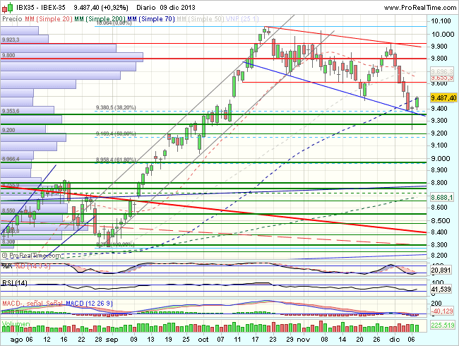 En las últimas sesiones, el Ibex, consolida en un movimiento expansivo, hasta los 9.400 puntos, zona de fuerte soporte, ya que en ese punto coinciden, soporte de largo plazo, 38,2% de retroceso y la directriz inferior de la figura expansiva, que provoca una figura de martillo con connotaciones alcistas confirmada en la ultima sesion con un nuevo impulso alcista, con primeros objetivos en los 9.600 – 9.800puntos.