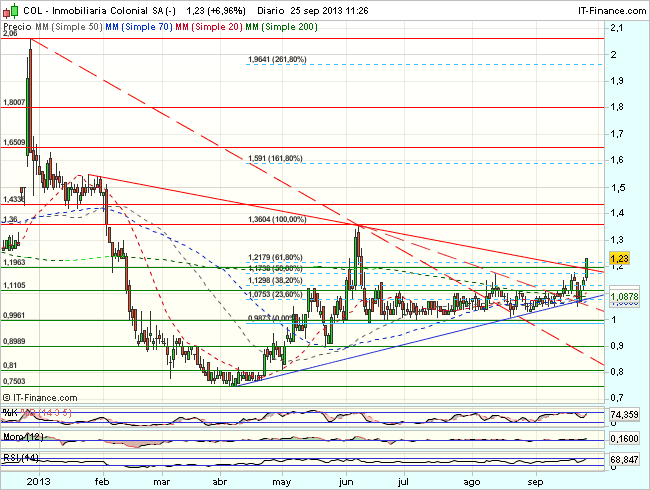 En consecuencia, la tendencia de de Inmobiliaria Colonial en el corto plazo es lateral alcista, con primeros objetivos en los 1,36 – 1,43 euros, si bien no es descartable una consolidacion en direccion al techo del rango en los 1,1 euros, antes de seguir con las subidas.