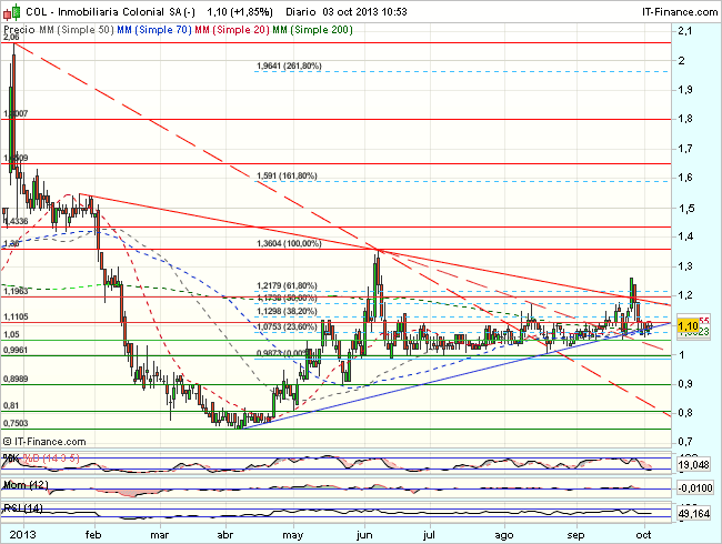 La tendencia de Inmobiliaria Colonial en el corto plazo, se mantiene en un rango lateral alcista, con base en el soporte de 1 euro, que pudiera ser de continuidad o agotamiento.