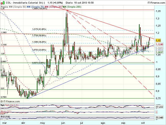 En consecuencia, la tendencia de de Inmobiliaria Colonial en el corto plazo es lateral alcista, con primeros objetivos en los 1,2 – 1,26 euros.