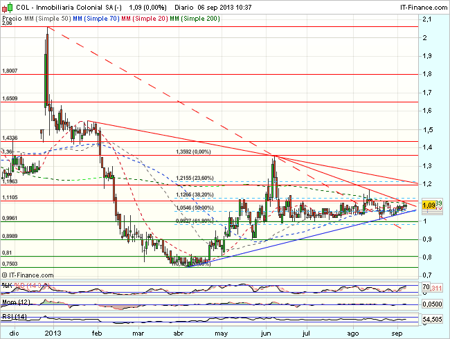 En la sesión de hoy, ataca el techo de una formación triangular, donde además se encuentran resistencia estática y media de 200 sesiones y por tanto difícil de superar, si bien por la misma razón, su superación al cierre, daría una señal de fortaleza e impulsaría los precios en dirección a los 1,2 euros. Por el contrario, la perdida de la base del triangulo, confirmada bajo los 1,03 abriría nuevos objetivos a la baja en los 1 – 0,90 euros.