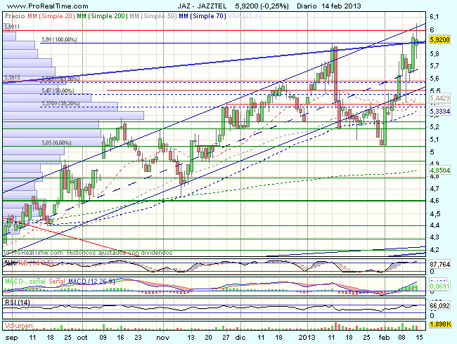 El aspecto grafico de Jazztel en el corto y medio plazo es perfectamente alcista, y tras encontrar  obstáculos en los 5,9 euros, que forzaron una violenta corrección, desarrolla un también fuerte impulso alcista, que en las ultimas sesiones recupera sobre los 5,9 euros, dando continuidad al impulso alcista de fondo.