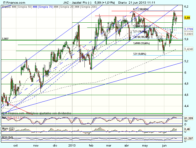 Jazztel, se encuentra bajo presión compradora en la sesión de hoy, dando continuidad al impulso alcista iniciado en los 5,87 euros y cotiza con beneficios del 0,77% en los 5,995 euros, atacando la resistencia relevante de los 6,00 euros.