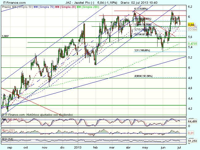 El aspecto grafico de Jazztel en el corto y medio plazo es alcista, aunque tras encontrar  obstáculos en la zona de los  6,10 euros, inicia una corrección, que toma la forma de un movimiento lateral, con techo en los 6,10 euros y que hay que vigilar, ya que pudiera ser de continuidad o agotamiento.