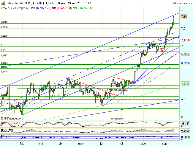 En consecuencia, la tendencia de Jazztel en el corto plazo es alcista, con primeros objetivos en los 8 – 8,35 euros.