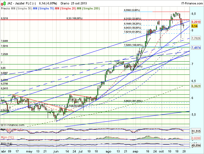Mientras Jazztel se mantenga bajo los 8,55 euros, el impulso bajista permanecerá vigente, su superación, por el contrario, abriría la puerta a mayores alzas, en dirección a los 9 euros.