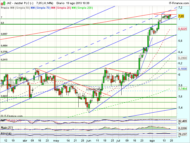 En consecuencia, la tendencia de Jazztel en el corto plazo es alcista, aunque en proceso de consolidación, en un rango estrecho entre los 7,08 y los 7 euros, que pudiera ser de continuidad o agotamiento.