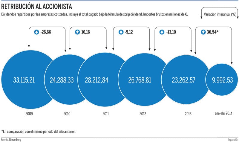 Veinte compañías del Índice General repartirán 5.300 millones de euros a los inversores en los próximos meses.