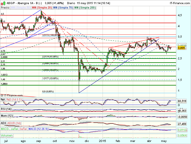 Se anota la mayor subida entre los valores que componen los principales índices bursátiles europeos. La compañía de energías renovables se desquita con fuerza del castigo sufrido en la recta final del pasado año, cuando se desplomó en Bolsa ante las dudas de los inversores sobre el cómputo de su deuda, lo que además abrió la puerta a la toma de posiciones bajistas. El valor, que cerró ayer en los 3,38 euros, cotiza al nivel de noviembre de 2014.(Ver análisis técnico de Abengoa)
