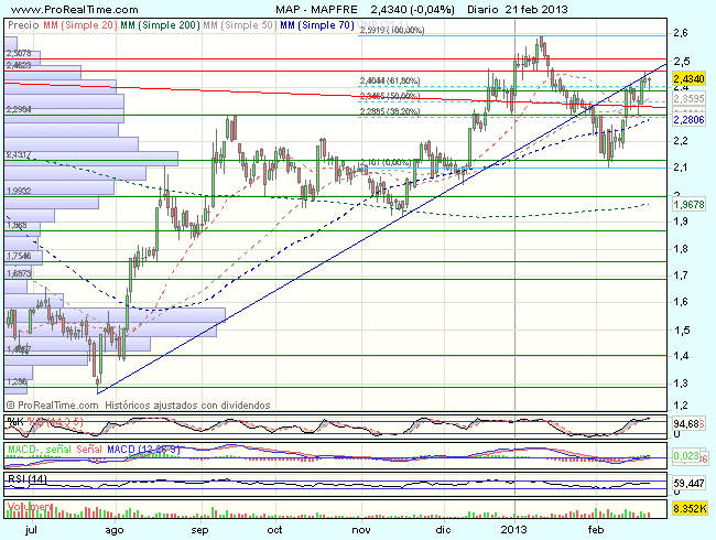 Mapfre sigue dando señales de fortaleza, a falta de confirmar al cierre, superando con fuerza y volumen, la resistencia de los 2,45 euros, con lo que confirma también la superación del 61,8% de recuperación del impulso bajista previo y recupera la directriz alcista de corto plazo.