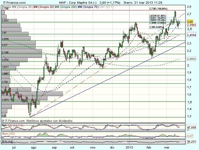 En consecuencia, la tendencia del Corporación Mapfre es alcista en el corto plazo, con primeros objetivos los 2,75 – 2,89 euros.