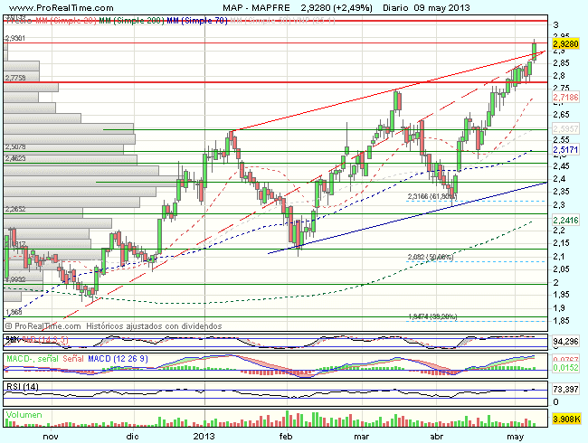 Corporación Mapfre, se encontraba bajo fuerte presión compradora en la sesión de hoy, continuando el impulso iniciado en el soporte relevante de los 2,77 euros y cerraba con beneficios del 2,49%, hasta los 2,928 euros, justamente en la resistencia intermedia, previa a los máximos.
