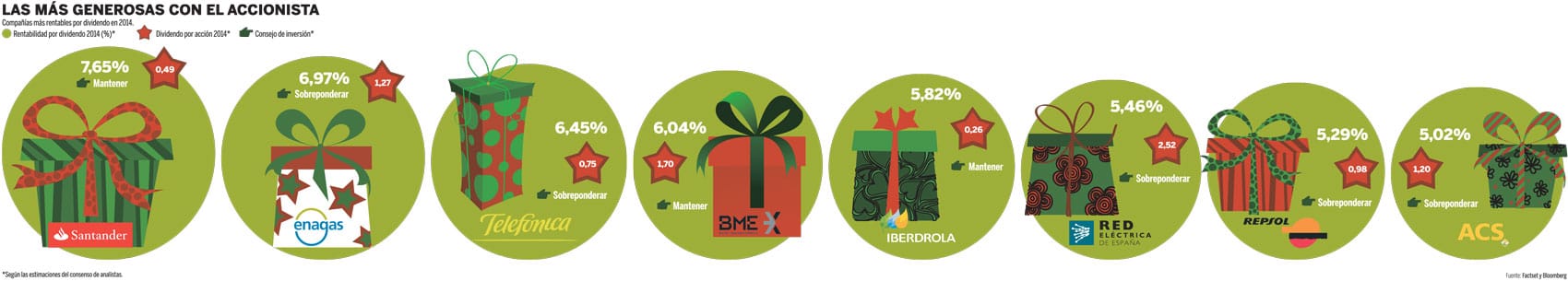 En este sentido, las ocho compañías del Ibex más rentables por dividendo serán: Santander, Enagás, Telefónica, BME, Iberdrola, Red Eléctrica, Repsol y ACS (ver gráfico).