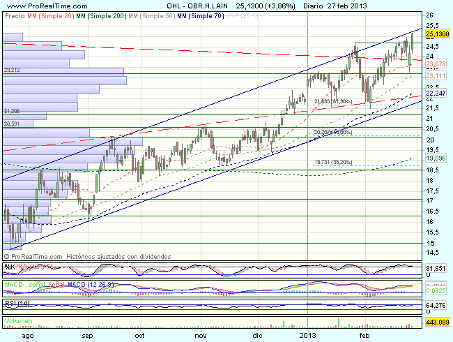 En consecuencia, la tendencia de OHL es alcista, con primeros objetivos en los 26,46 – 27,7 euros.