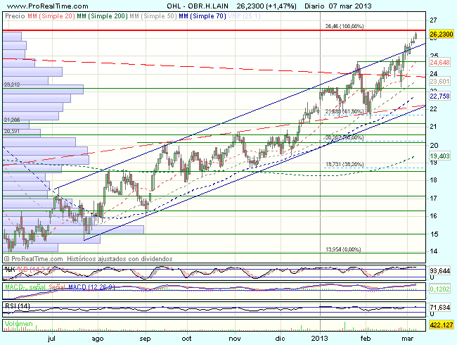 OHL, se mantiene bajo presión compradora en la sesión de hoy y cotiza con beneficios del 0,65%, en los 26,40 euros, recuperando el 100% de toda la caída previa desde mayo del 2011 y dando continuidad al impulso alcista de largo plazo que viene desde los mínimos de 2.009.