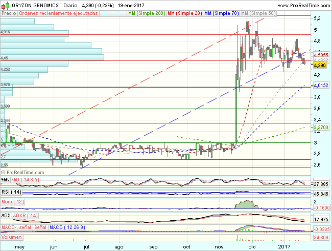 En consecuencia, la tendencia de ORYZON GENOMICS en el corto plazo, es alcista, aunque en proceso de consolidacion,con primeros objetivos en los 4,25 – 4 euros.