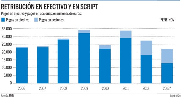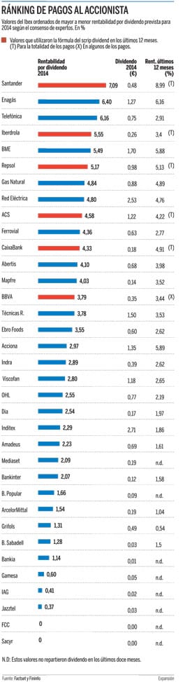 La entidad financiera ha liderado el ranking de la Bolsa española de rentabilidad por dividendo en 2013, superior al 9%, y mantendrá el primer puesto en 2014, con un 7,36%. Este descenso se debe a que el consenso de analistas que recoge Factset prevé que el dividendo pase de 0,60 a 0,48 euros, un fuerte descenso que solo podría justificarse por un pago en metálico y que chocaría en todo caso con la política de continuidad en la retribución al accionista mantenida por el banco. Santander ha pagado esos 0,60 euros por acción durante cinco años consecutivos. De hecho, la fórmula del scrip dividend ha permitido conservar el dividendo sin hacer apenas mella en el capital.