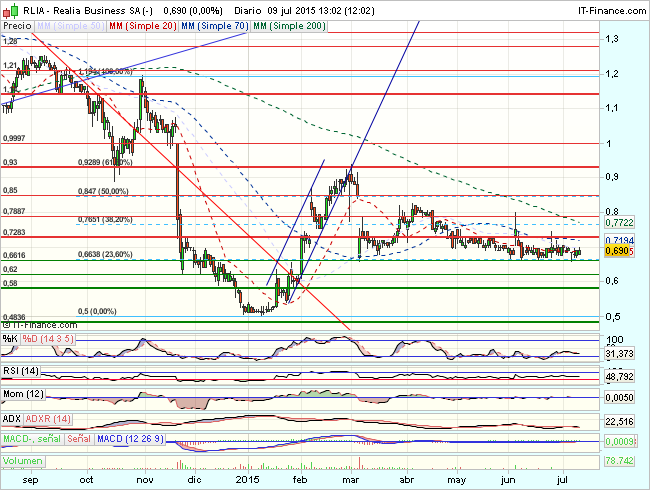 Por lo que se refiere a los indicadores técnicos de REALIA, el índice de movimiento direccional ADX es bajista, bajo ADXR, mientras el indicador de convergencia divergencia MACD, es negativo y bajista, sobre su línea de señal, y el oscilador de momentum es negativo y bajista, indicadores que muestran un debilitamiento en la tendencia de REALIA