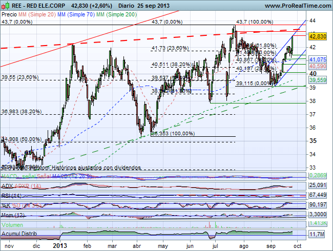REE mantiene en el muy largo y largo plazos una prolongada fase alcista que llevó el precio, el pasado día 22 de julio,  hasta 43,7 euros donde encontró obstáculos que dieron lugar a un impulso bajista, que encontró soporte en los 39,115 euros y media de 200 sesiones desde donde rebota al alza.