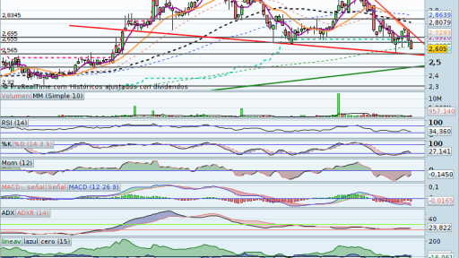 Aspecto feo, sin continuidad en el rebote y fuerte vuelta, aunque siga en zona interesante, por cercanía del soporte en torno a 2,56€