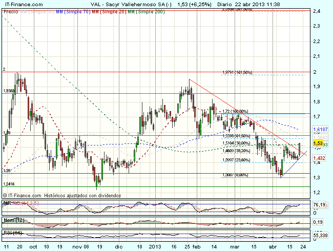 En las ultimas sesiones define un movimiento bajista al que sigue un fuerte impulso alcista, que en esta sesión y a falta de confirmar al cierre, supera el 50% de retroceso del impulso bajista previo, la media de 200 sesiones y los máximos de impulso previo, dando continuidad al movimiento alcista previo en direccion a los 1,72 euros.