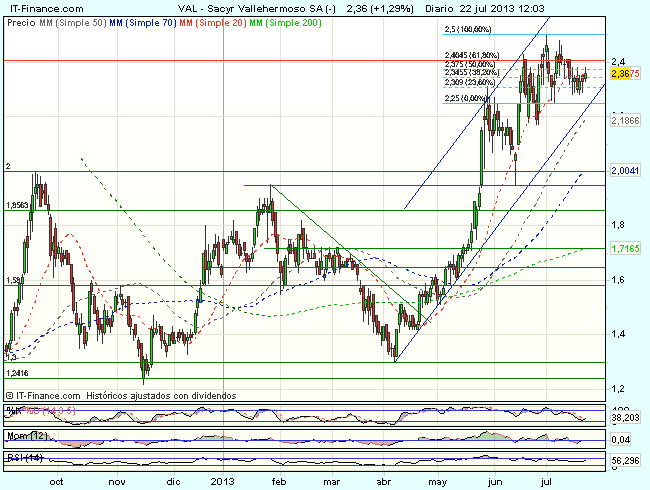 En la sesión de hoy, ataca el 50% de recuperación de la caída previa en los 2,375 euros, cuya superación, confirmada al cierre, abriría nuevos objetivos en los 2,4 – 2,5 euros.