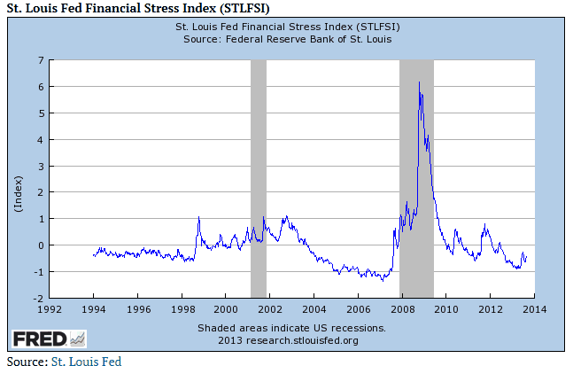 La Fed de St. Louis tiene un indicador propio para medir la complacencia de los inversores, el llamado «índice de estrés financiero (STLFSI)«. Como señala el analista Barry Ritholtz, este indicador combina 18 diferentes serie de datos para establecer una lectura que indice el sentimiento de los inversores hacia el mercado.