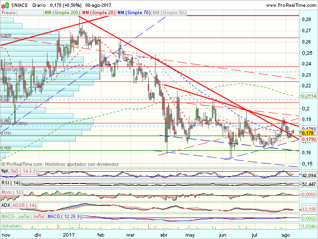 En el medio plazo, Sniace encuentra apoyos en los 0,08 euros, para un fuerte impulso alcista que encuentra obstaculos en forma de doble techo en los 0,3 euros.