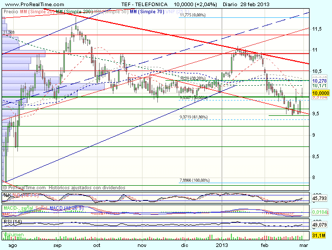 En el corto plazo, mientras los precios se mantengan bajo los 10,3 euros, existe peligro de vuelta, y mayor plazo, mientra Telefónica no supere los 11,10 euros, no podemos esperar una mejora de las posibilidades alcistas.