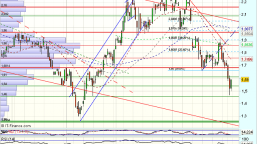 En el medio plazo, tras encontrar apoyos en los 1,25 euros, Abengoa inicia un fuerte impulso alcista canalizado, que encuentra obstáculos en los 2,29 euros, forzando una consolidación.
