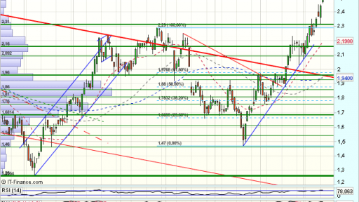 En el medio plazo, tras encontrar apoyos en los 1,25 euros, Abengoa inicia un fuerte impulso alcista canalizado, que encuentra obstáculos en los 2,29 euros, forzando una consolidación.
