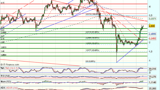 En el medio plazo, tras encontrar apoyos en los 1,25 euros, Abengoa supera la directriz bajista de medio plazo y el 100% de recuperacion de todo el impulso bajista previo, dando continuidad al movimiento alcista hasta los 4,75 euros.