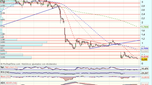 En el largo plazo, Abengoa, tras encontrar obstáculos en los 4,73 euros, inicia un fuerte impulso bajista, hasta soportes de largo plazo en los 1,25 euros.