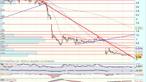 En el largo plazo, Abengoa, tras encontrar obstáculos en los 4,73 euros, inicia un fuerte impulso bajista, hasta soportes de largo plazo en los 1,25 euros.