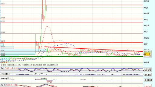 En el medio plazo se impulsa, acelerando tendencia sucesivamente, en un impulso alcista, que encuentra obstáculos en los la resistencia relevante de los 0,61 euros, que fuerzan fuerte impulso bajista.