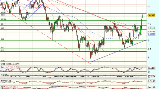 En el medio plazo, Arcelor dibuja una formación de triple suelo en los 8,35 euros que fuerzan un impulso alcista.
