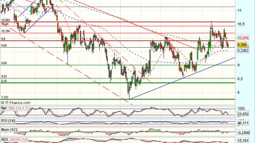 En el largo plazo, Arcelor, desde que formara un doble techo en los 34,5 euros, mantiene una fuerte tendencia bajista, que deriva en un rango lateral, con suelo en el soporte de los 8,35 euros.