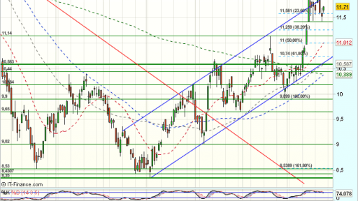 Arcelor Mittal, se encuentra bajo presion compradora en la sesión de hoy , tras las fuertes caidas previas, y cotiza durante la jornada, con beneficios del 1,12% en los 11,70 euros, tras rebotar en el soporte de los 11,43 euros.