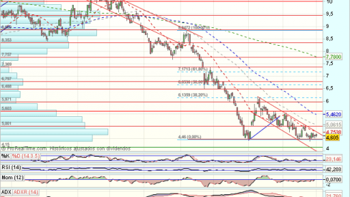 En el largo plazo, Arcelor, desde que formara un doble techo en los 34,5 euros, mantiene una fuerte tendencia bajista, que deriva en un rango lateral, con suelo en el soporte de los 8,35 euros.